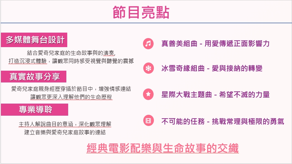 就像電影《不可能的任務》中的主角,愛奇兒家庭也在看似不可能的挑戰中,創造出屬於他們的奇蹟。透過好萊塢經典大片與宮崎駿動畫的熟悉旋律,每一個音符都承載著生命轉化的力量。