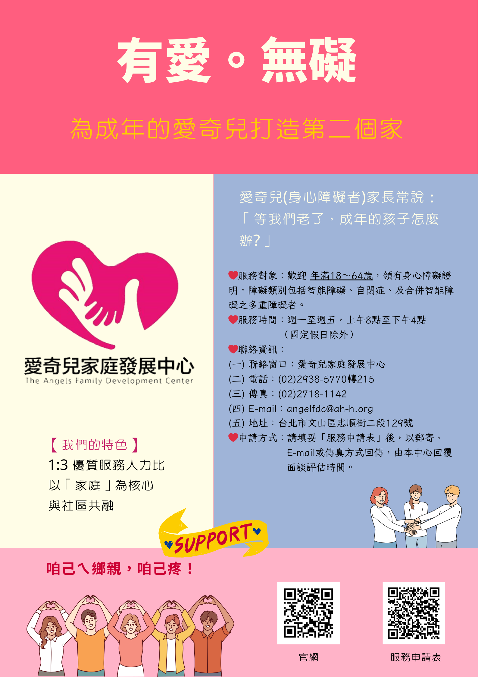 天使心家族陪伴愛奇兒家庭已滿20年,隨著長期服務愛奇兒家庭,除了陪伴及支持父母與手足外,更能了解隨著年紀增長,年邁的父母對於日漸長大的愛奇兒,其照顧需求也變得更加困難與艱辛,於是天使心家族設立了「愛奇兒家庭發展中心」,期待能減輕父母在照顧上的壓力與負荷,並能活出自己的生活與價值。