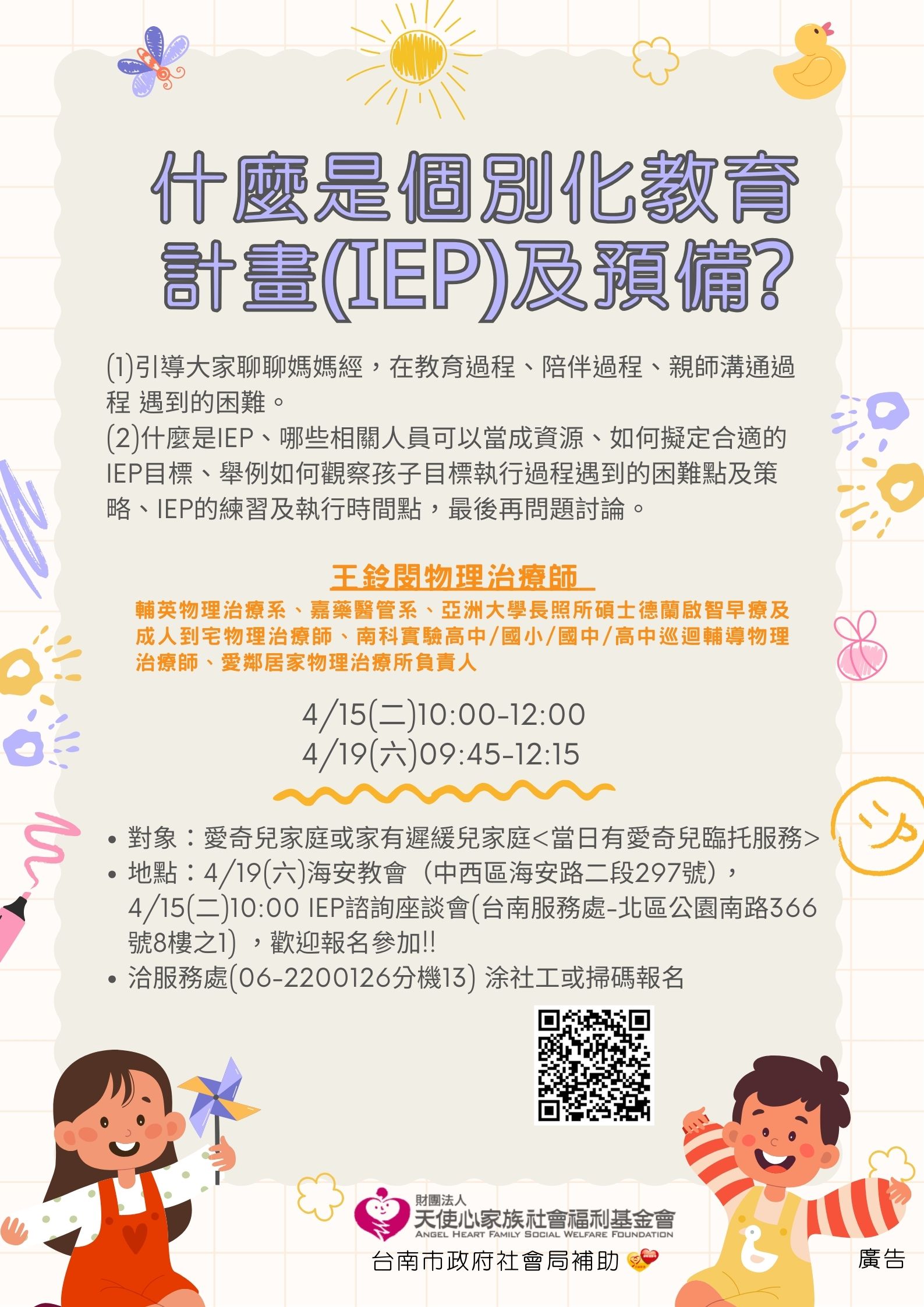 【地點】:4/19~海安基督教會(中西區海安路二段297號1樓),4/15(IEP諮詢座談會)~台南服務處(公園南路366號8樓之1)