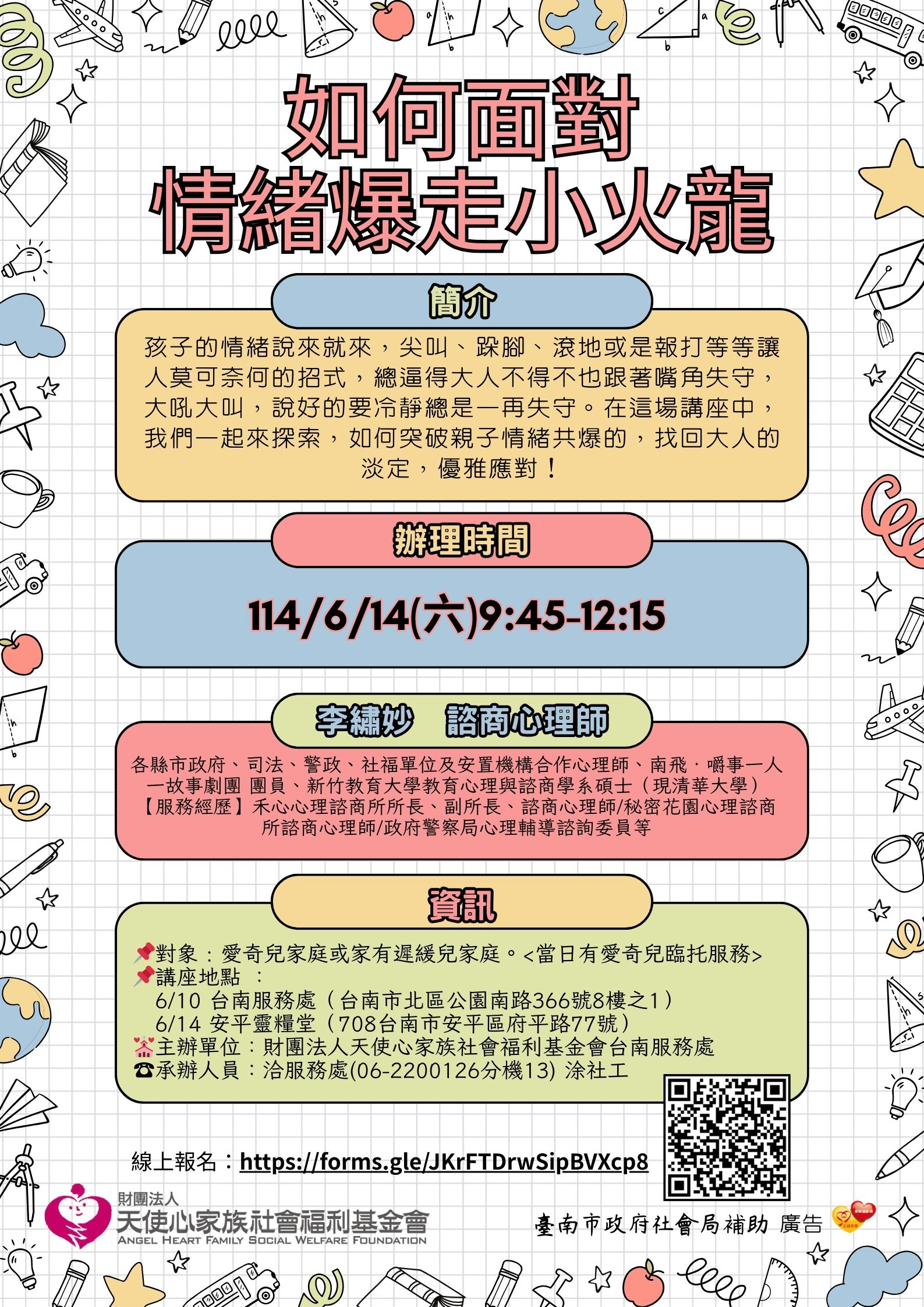 另6/10(二)10:00 諮詢講座【高情緒需求孩子的應對】台南服務處