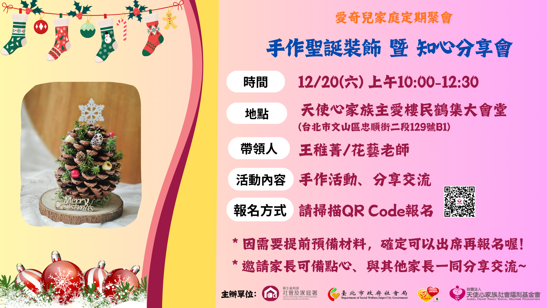 歲末年終的溫馨聖誕月,家長們期待已久的團聚活動又來囉!歡迎一起來天使心享受溫馨節慶,以手作聖誕裝飾療癒開始,於分享交流中重新得力!